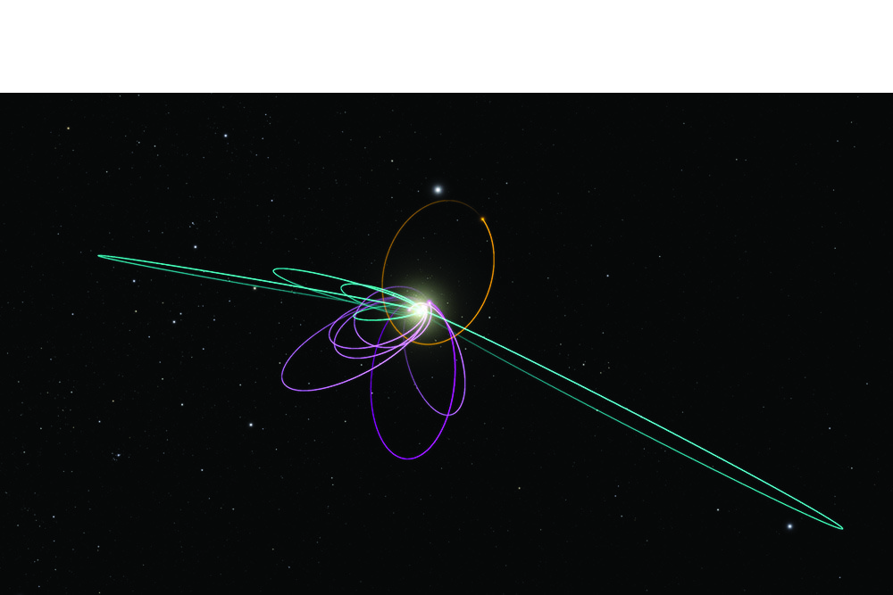 A predicted consequence of Planet Nine is that a second set of confined objects should also exist. These objects are forced into positions at right angles to Planet Nine and into orbits that are perpendicular to the plane of the solar system. Five known objects (blue) fit this prediction precisely.