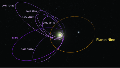 The six most distant known objects in the solar system with orbits exclusively beyond Neptune (magenta) all mysteriously line up in a single direction. Moreover, when viewed in three dimensions, they are all tilted nearly identically away from the plane of the solar system. Such an orbital alignment can only be maintained by some outside force. In their new paper, Konstantin Batygin and Mike Brown show that a planet with 10 times the mass of the earth in a distant eccentric orbit anti-aligned with the other six objects (orange) is required to maintain this configuration.