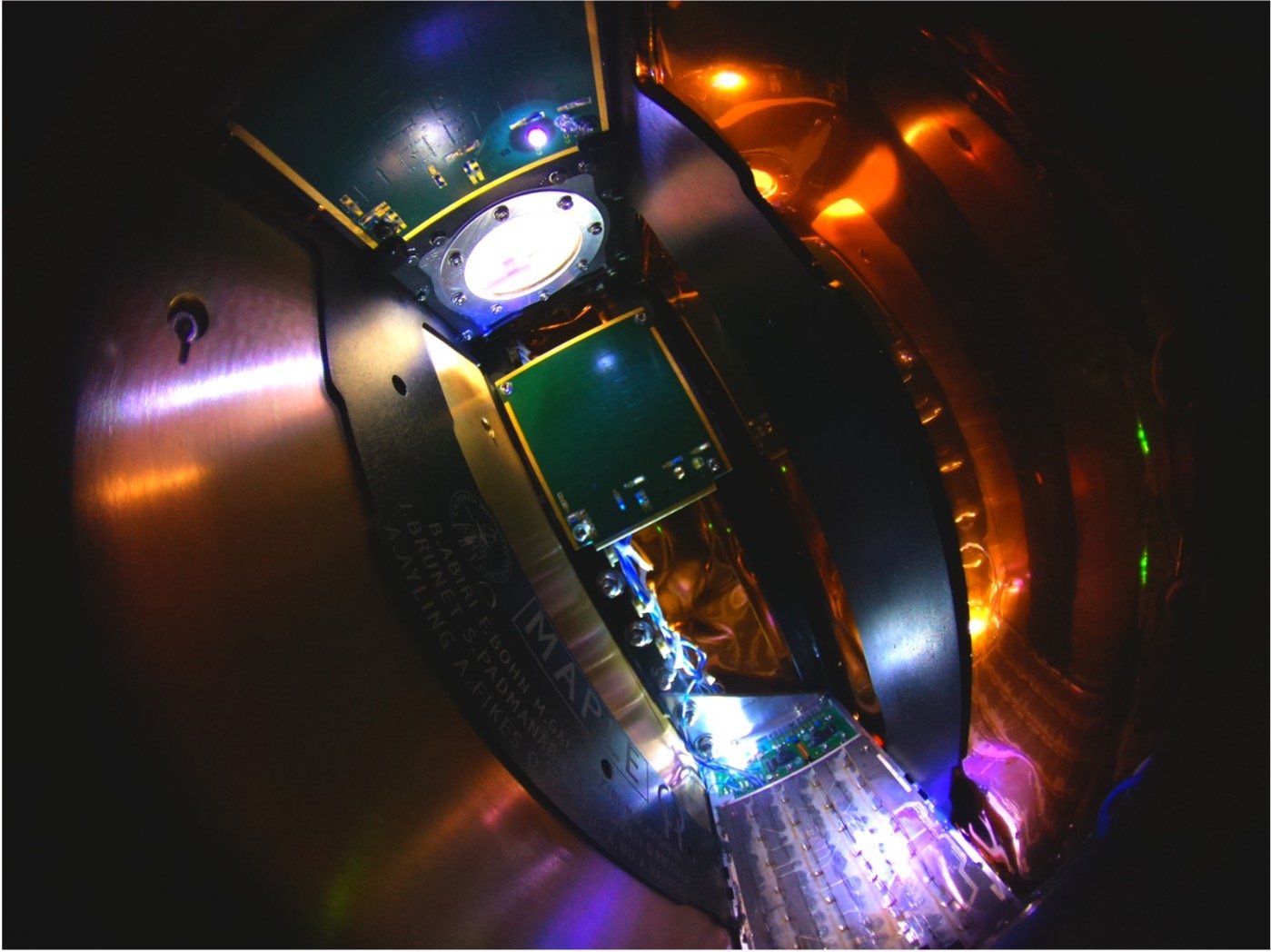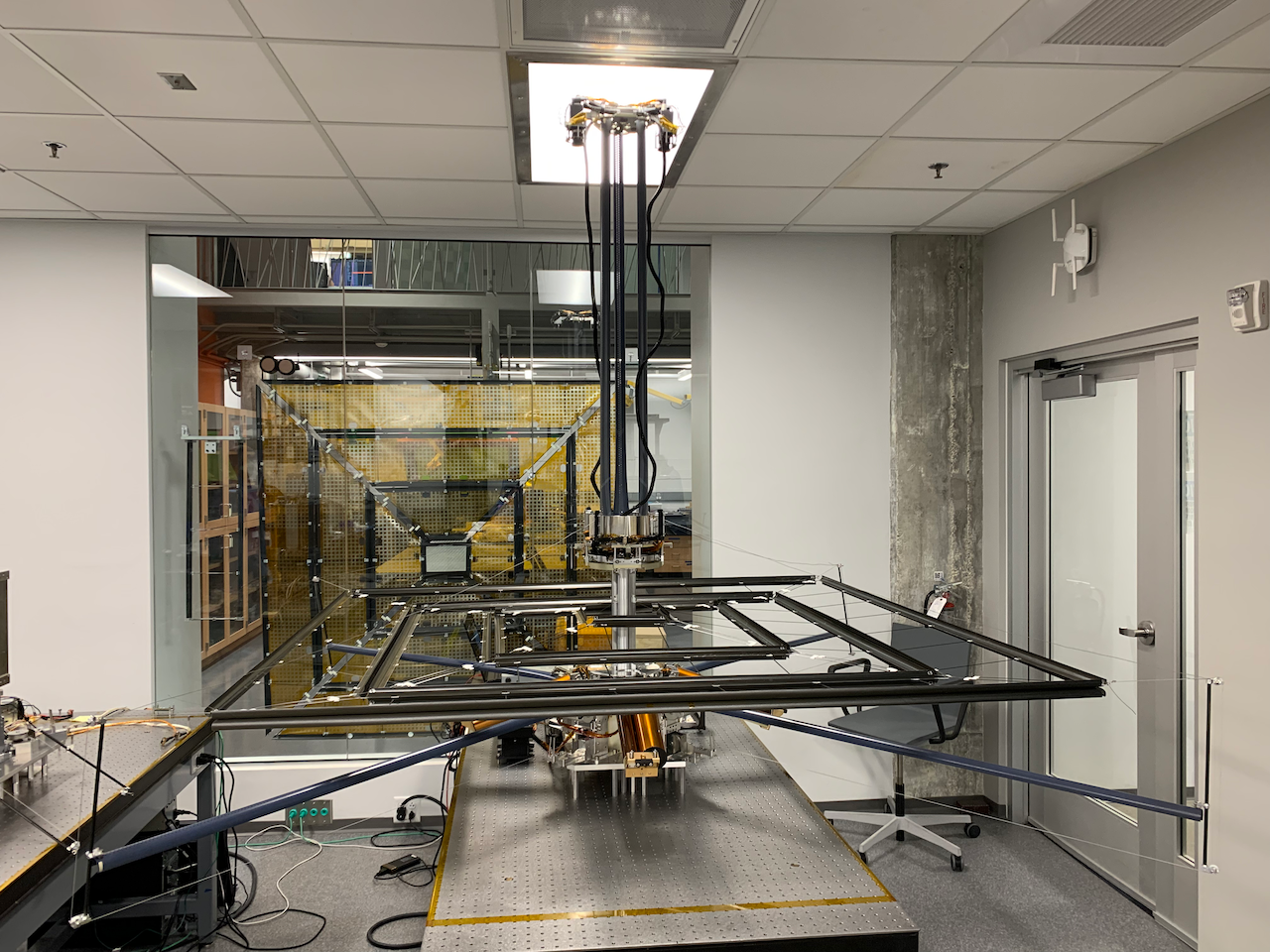 A view from inside MAPLE, which will demonstrate wireless power in space. This angle shows both the array of flexible light weight microwave power transmitters (right side) and the two receivers that they will transmit power to (left side). The top receiver is receiving power in this picture, and it is lit by this wirelessly transmitted power.